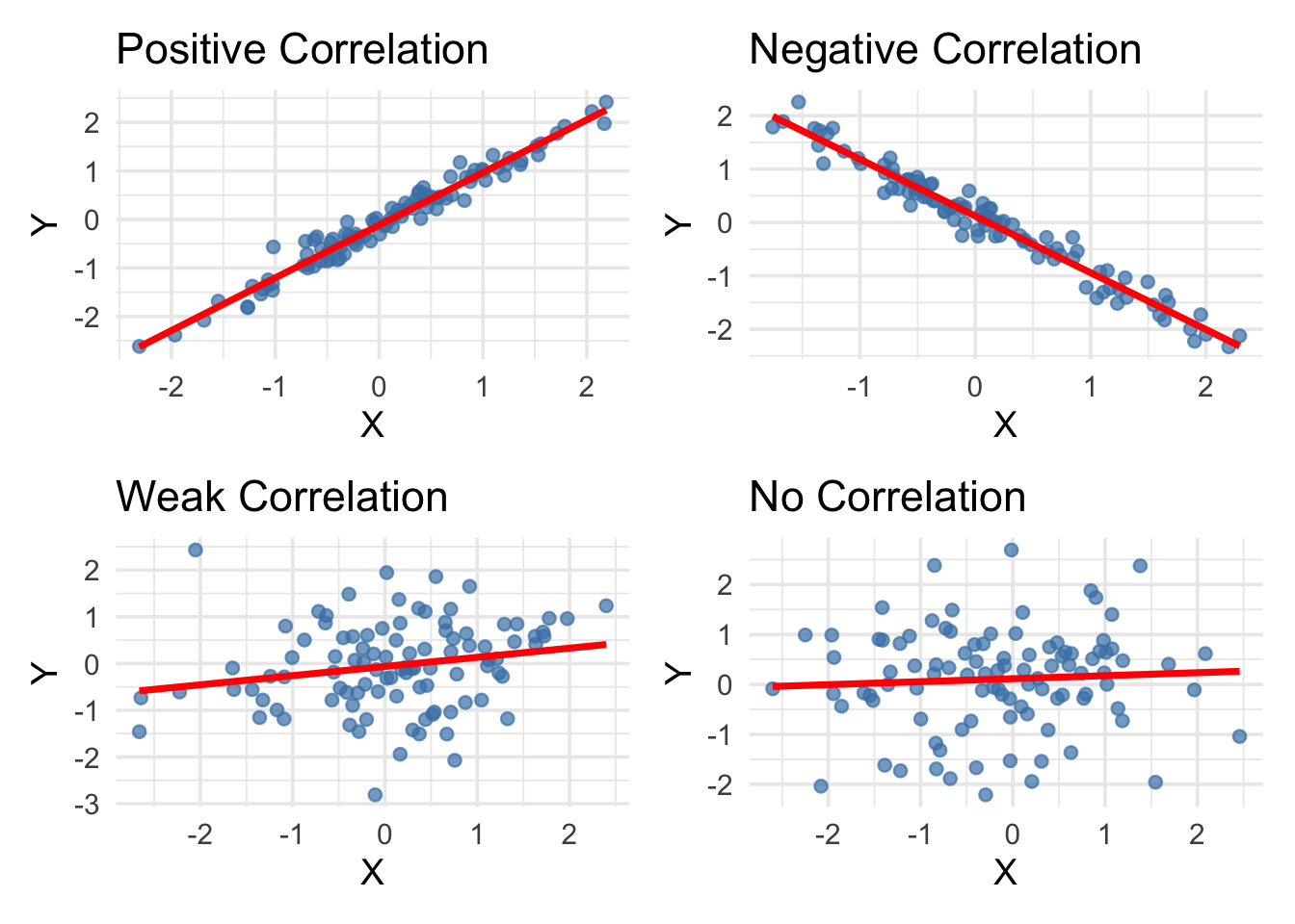 \(r = 0\): ไม่มีความสัมพันธ์เชิงเส้นระหว่าง \(x\) และ \(y\)