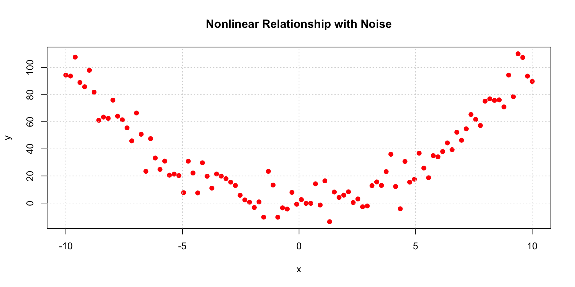 ในกรณีนี้ ความสัมพันธ์ระหว่าง \(x\) และ \(y\) ไม่ได้อยู่ในแนวเส้นตรง แต่เป็นรูปโค้ง เช่น พาราโบลา (parabola) — ซึ่ง Pearson Correlation จะไม่สามารถจับความสัมพันธ์นี้ได้ชัดเจน