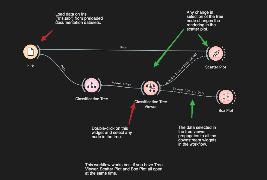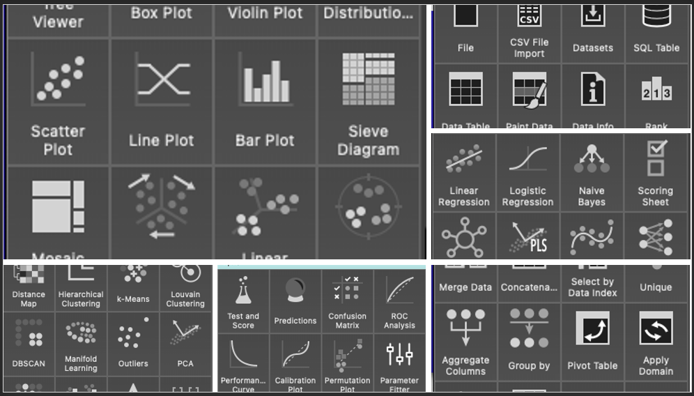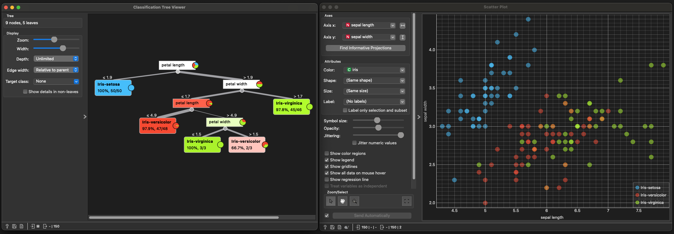 Orange มีเครื่องมือ Visualization ที่สามารถแสดงผลแบบ Interactive เช่น Scatter Plot, Heatmap, Decision Tree, Network Graph