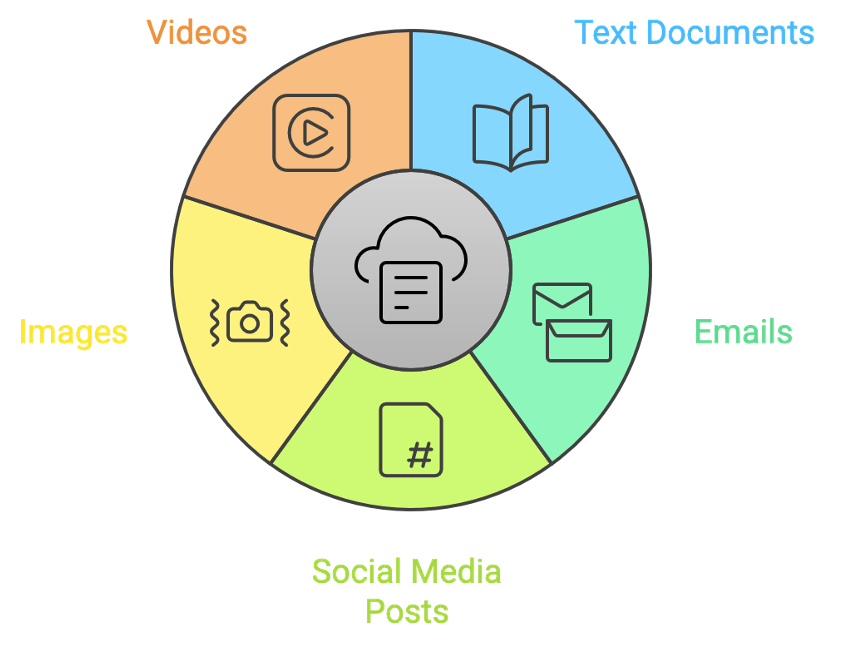 ข้อมูลข้อความ (Text Data): เช่น อีเมล ข้อความในสื่อสังคมออนไลน์ บทความ ฯลฯ