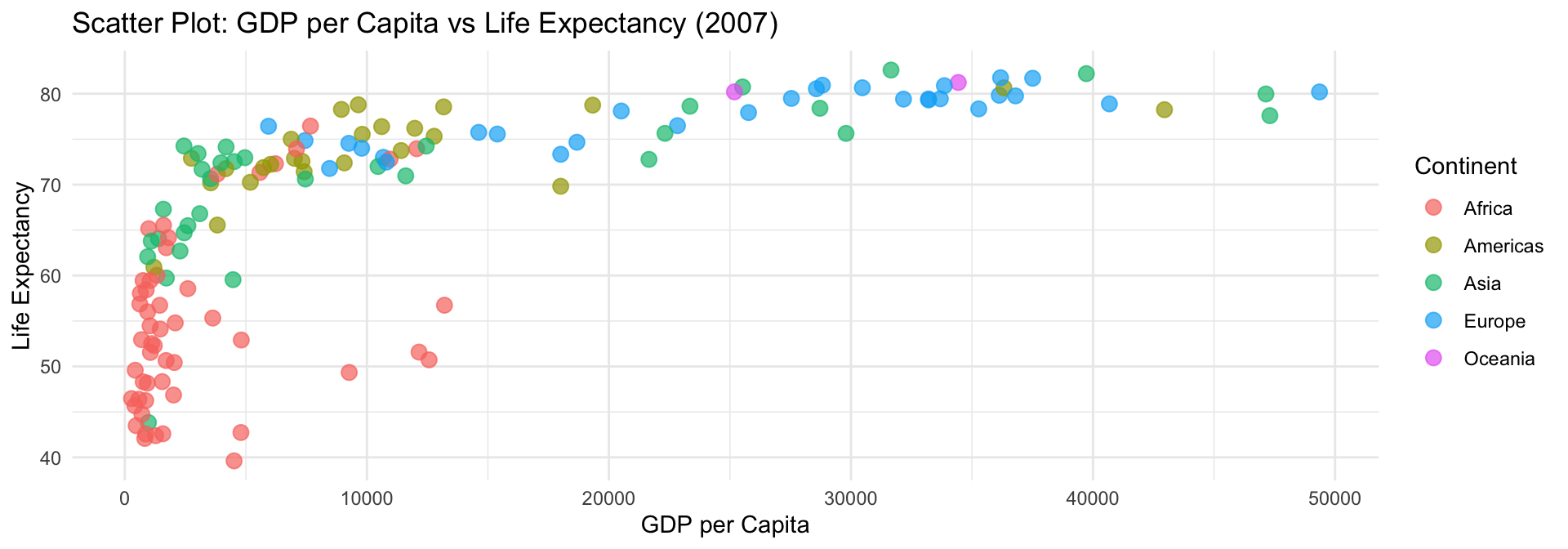 กราฟกระจาย (Scatter Plot): แสดงความสัมพันธ์ระหว่างตัวแปรสองตัว เช่น ราคาบ้านเทียบกับขนาดที่ดิน