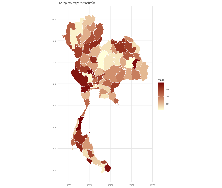 Choropleth Map (แผนที่เชิงพื้นที่ตามค่า): แสดงค่าข้อมูลตามพื้นที่ เช่น รายได้เฉลี่ยต่อจังหวัด
