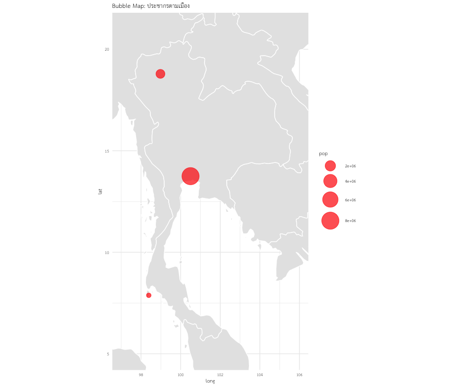 Bubble Map (แผนที่ฟองอากาศ): ใช้ตำแหน่งและขนาดของฟองเพื่อแสดงค่าของข้อมูลในพื้นที่ต่าง ๆ