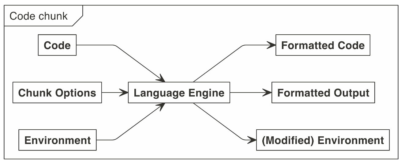 - ชุดคำสั่งโดยภาษาคอมพิวเตอร์ที่รองรับ ซึ่งจะเรียกเนื้อหาส่วนนี้ว่าก้อนคำสั่ง (code chunks) โดยทั้งก้อนคำสั่งในหนังสือเล่มนี้ จะเป็นการทำงานด้วยภาษาอาร์