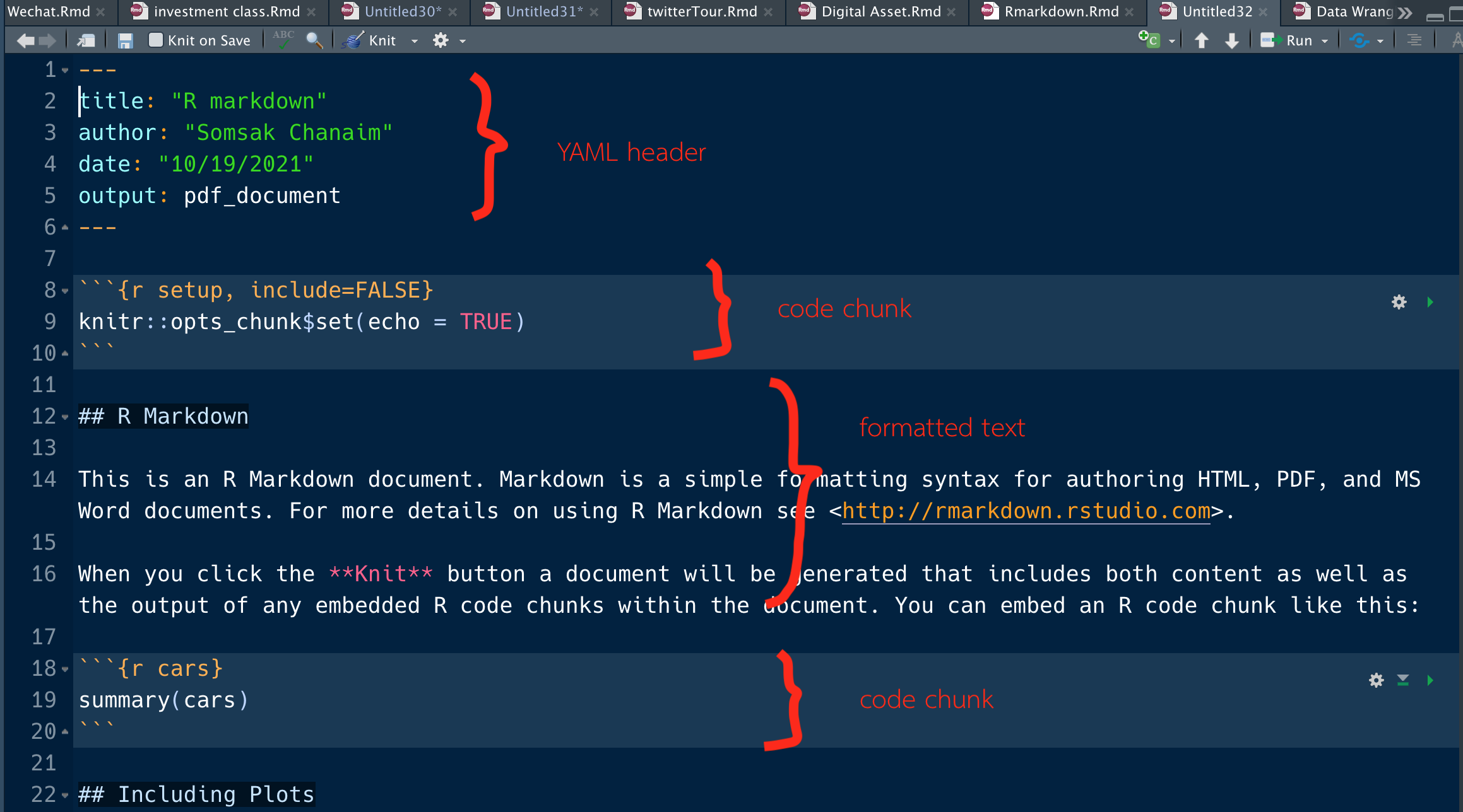 code chunks การเขียนคำสั่งด้วยภาษาอาร์ พร้อมการผลลัพธ์ที่ได้จากการทำงาน ซึ่งจะแสดงผลลัพธ์การคำนวณ แสดงคำสั่งที่เขียน กำหนดขนาดกราฟหรือไม่ก็ได้ข้ึนอยู่กับการตั้งค่า