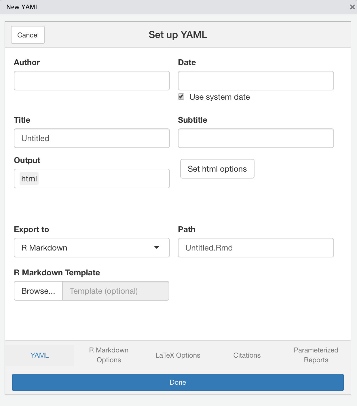 คือการกำหนดชนิดของเอกสารอิเล็กทรอนิกส์ (Electronic Document) ที่ต้องการเช่น เอกสารแบบ HTML หรือ PDF หรือ docx หรือ ptt เป็นต้น และทำการกำหนดรายละเอียดที่ต้องการ เช่น ธีม พื้นหลัง ชุดตัวอักษรที่ต้องการ ขนาดเอกสาร การจัดขอบเอกสาร การใส่ชื่อเรื่อง ผู้แต่ง สถาบัน หรือวันเวลา เป็นต้น การตั้งค่าส่วนนี้เรียกว่า YAML header