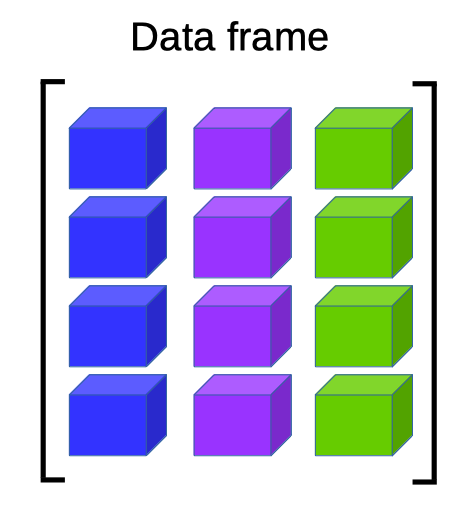 กรอบข้อมูล (data frame): เป็นโครงสร้างข้อมูลที่เก็บข้อมูลเป็นแถวและคอลัมน์ คล้ายกับตารางในฐานข้อมูล โดยแต่ละคอลัมน์สามารถเก็บข้อมูลของประเภทต่างๆ ได้