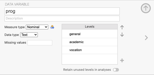 - “prog”: เป็นตัวแปรที่เราสนใจทำนายหรือวิเคราะห์ และมีประเภทของโปรแกรมการเรียน