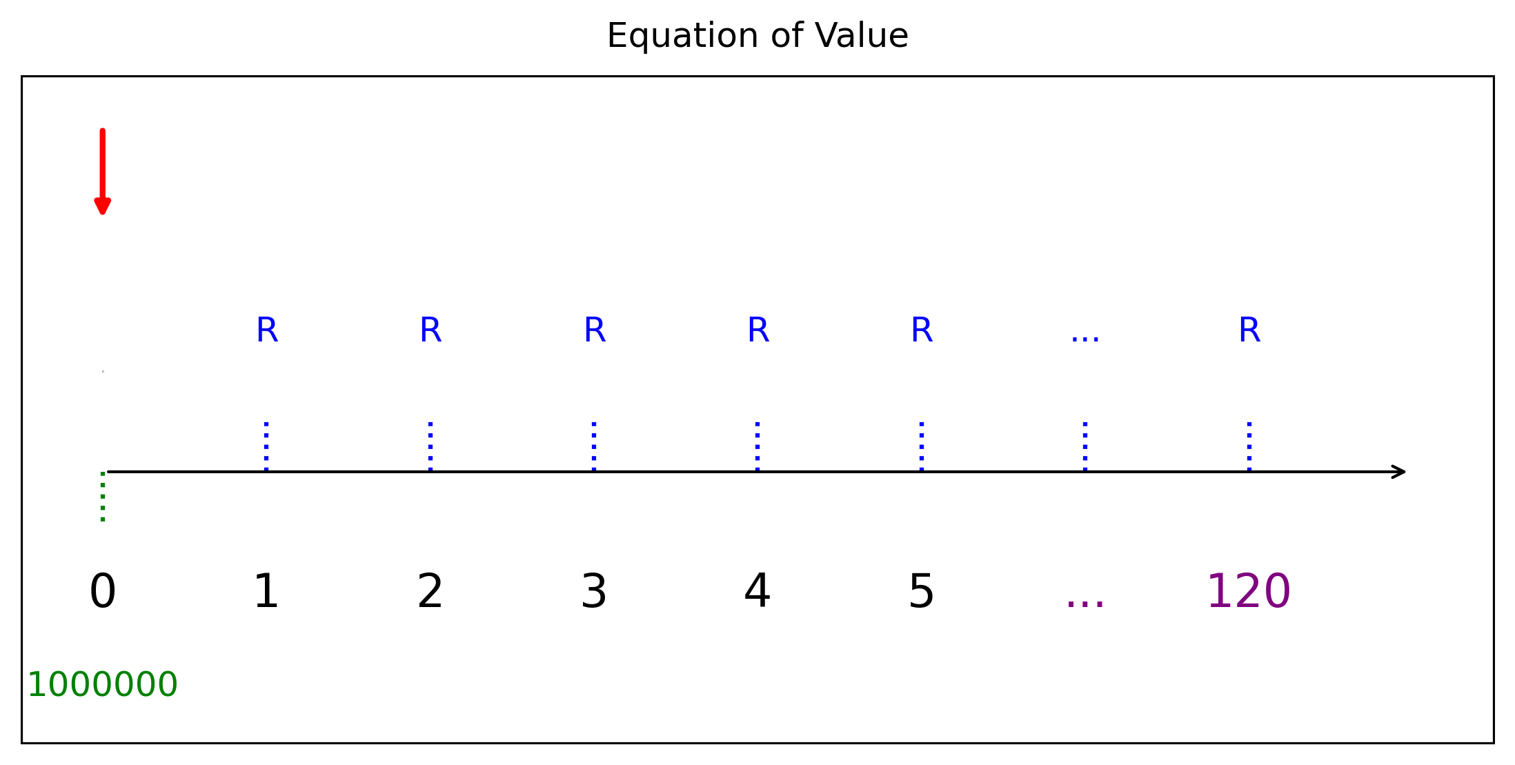 อัตราดอกเบ้ียต่อเดือนคือ \(i =i^{(12)}/12=0.06/12=0.005\) สมการแห่งมูลค่าคือ \[1,000,000=R\cdot a_{\overline{120}|i}, = 0.005\]