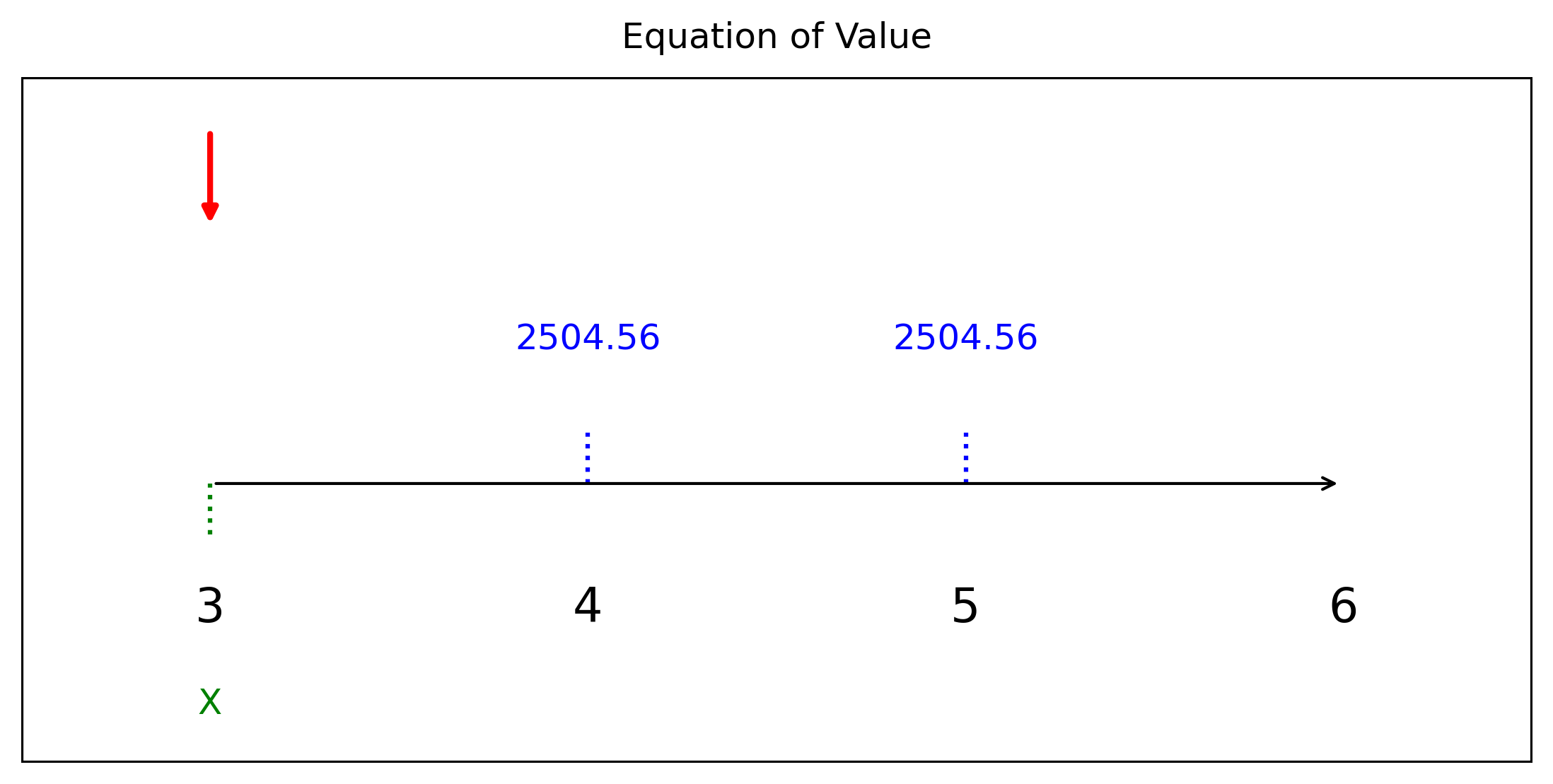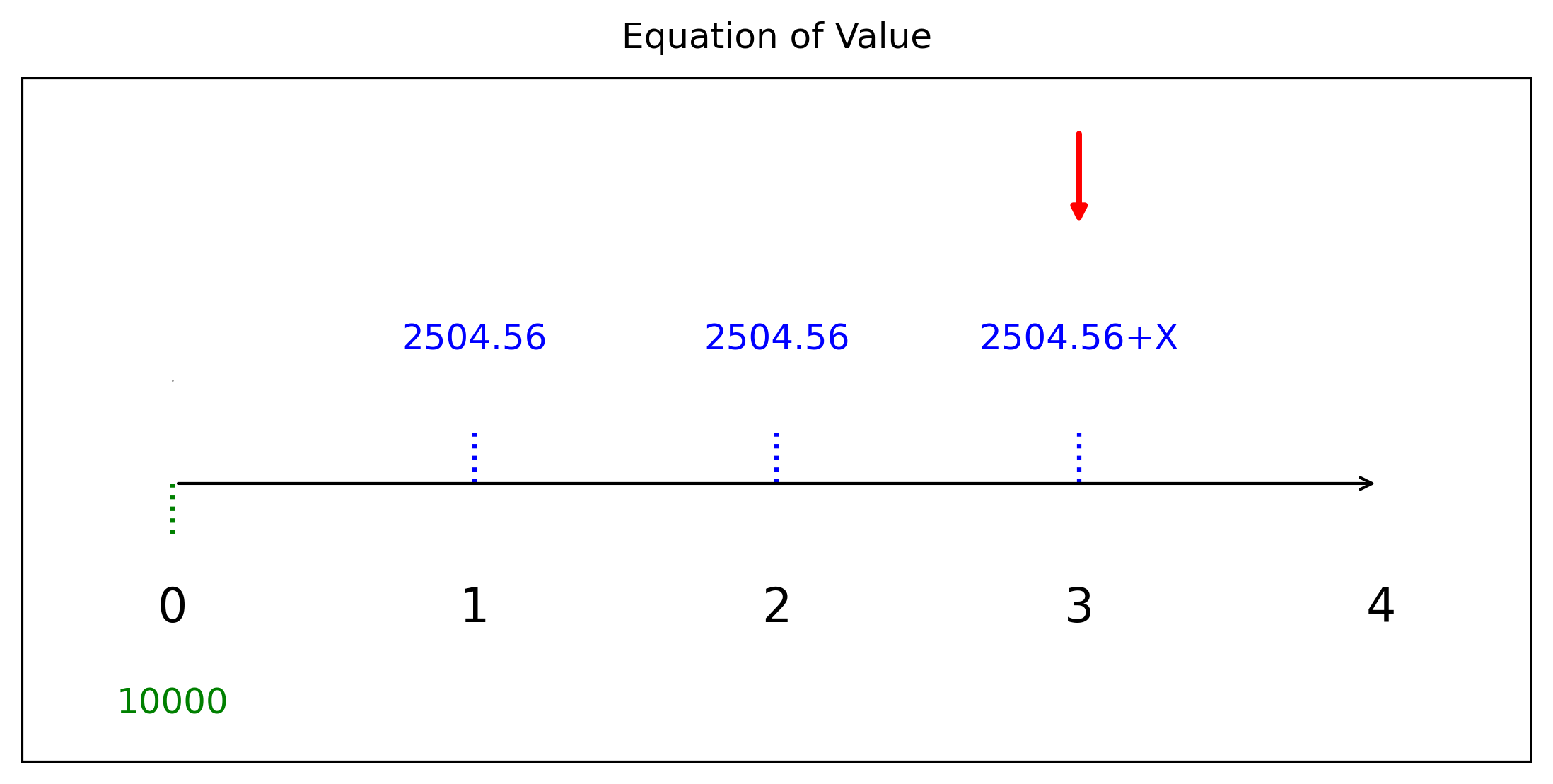 สมการมูลค่า คือ \[10000\cdot(1+i)^3 = 2504.56\cdot s_{\overline{3}|i}+X, i=.08\]