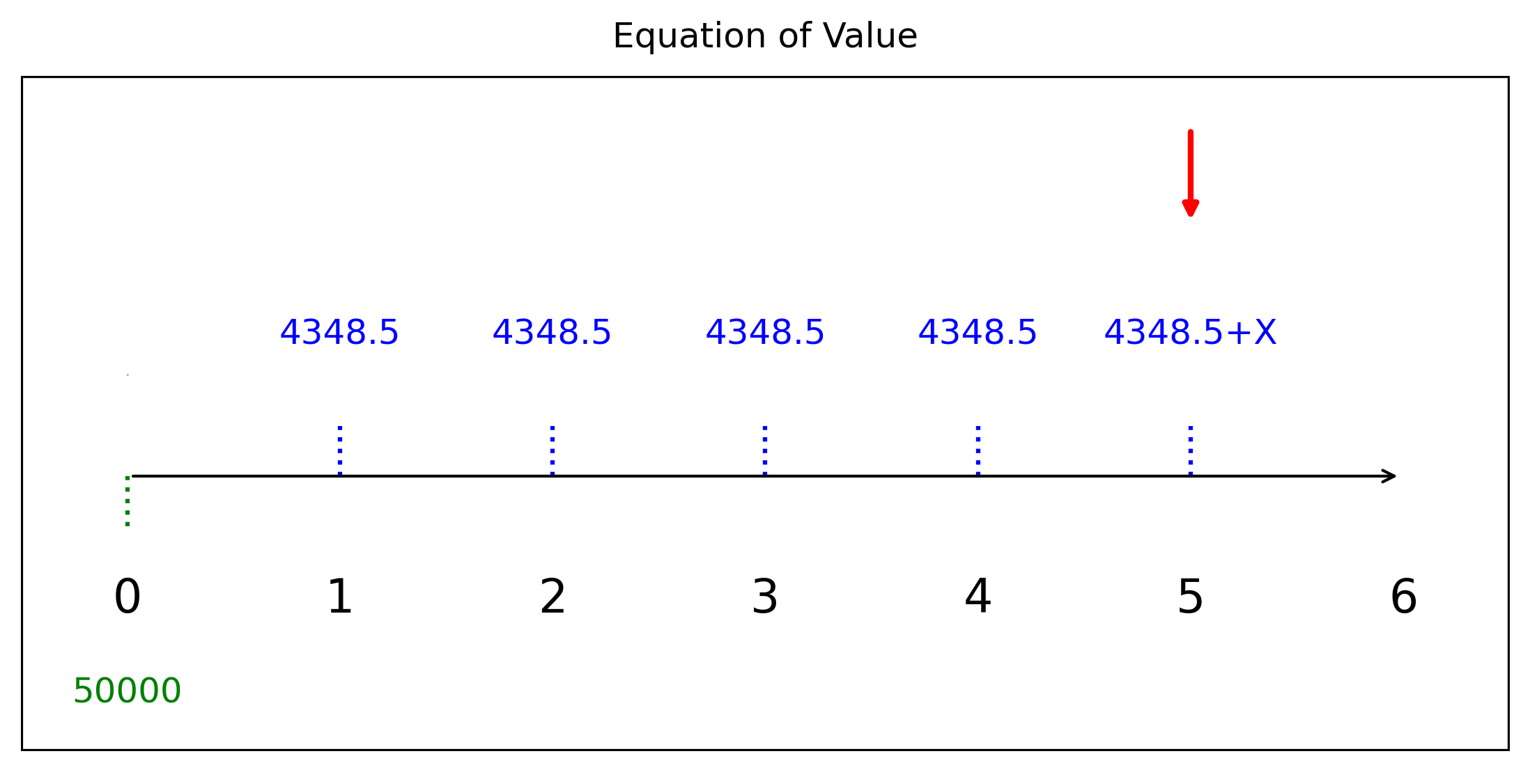 เทียบกับตัวอย่างที่ผ่านมาสมการแห่งมูลค่าคือ \[X = 50000\cdot (1+i)^5-4348.5\cdot s_{\overline{5}|i},~i =0.015\]
