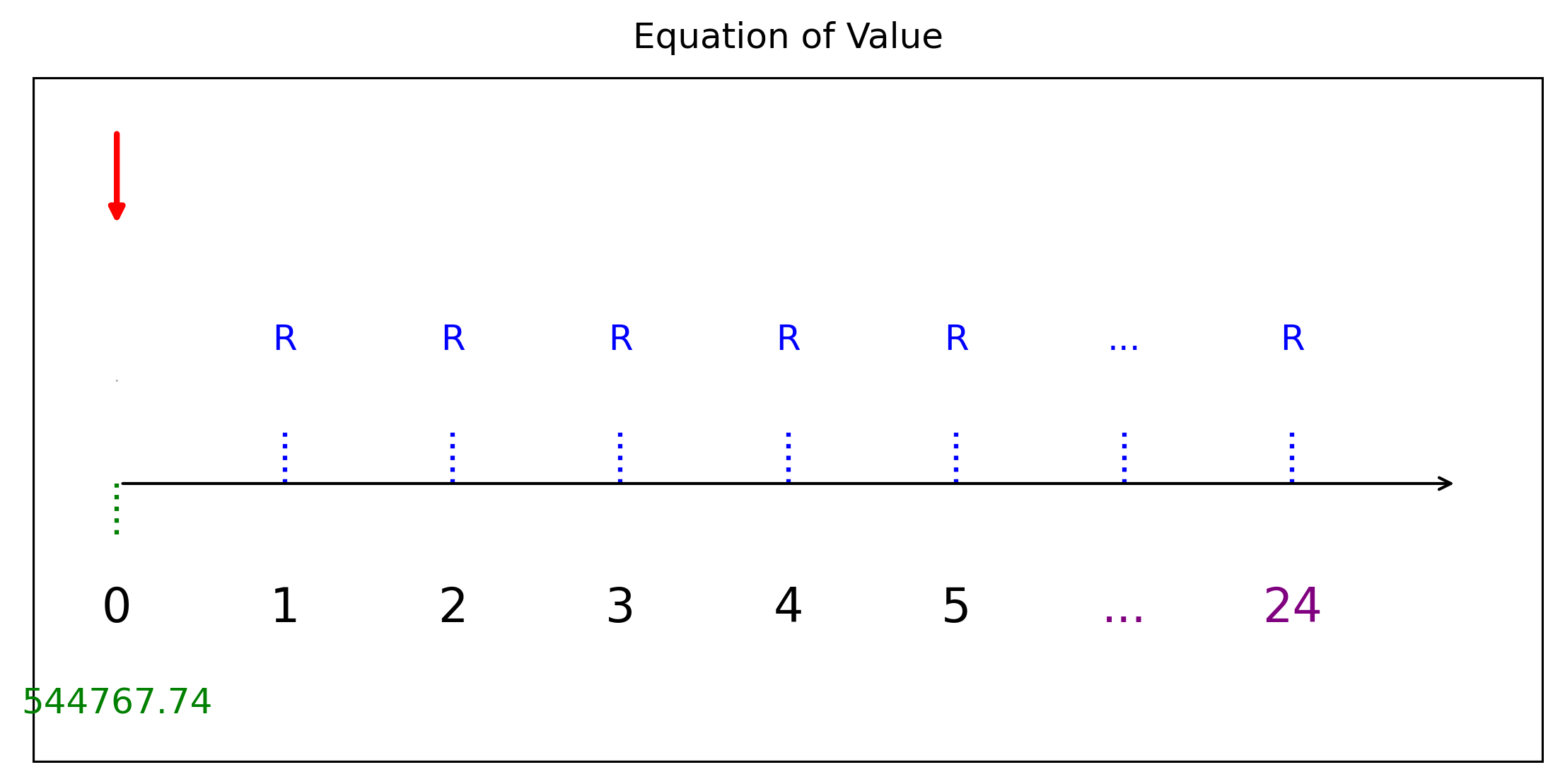 สมการแห่งมูลค่าคือ \[R = 544767.74/a_{\overline{24}|i},~ i =0.005\]