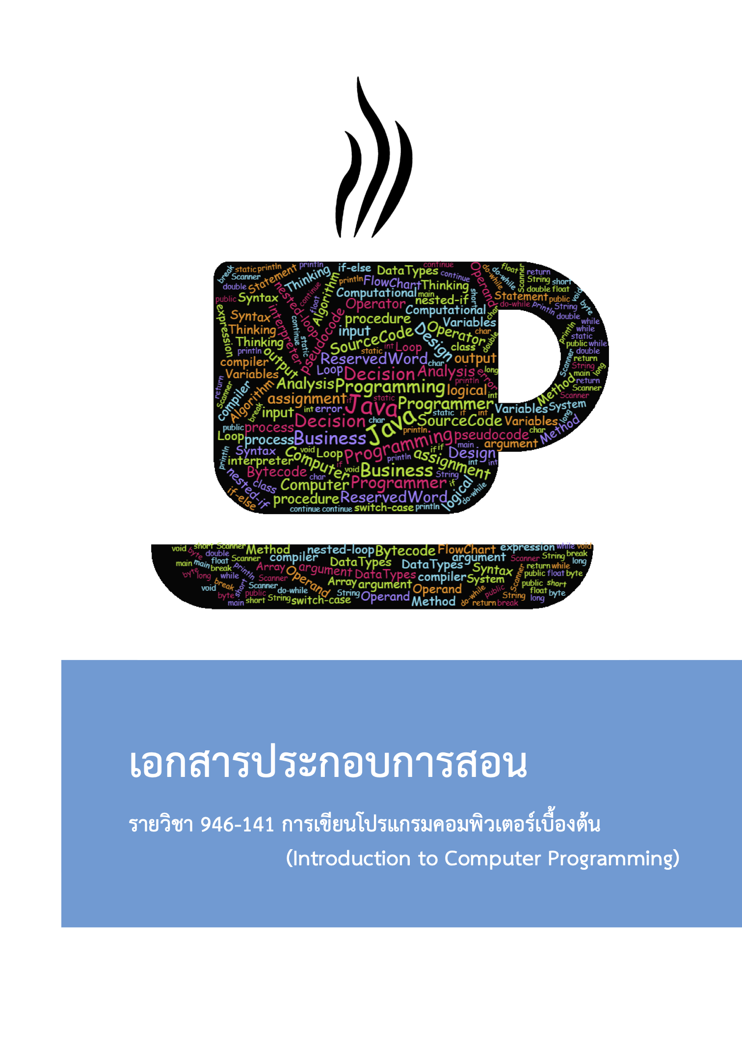 เอกสารประกอบการสอนนี้เรียบเรียงขึ้นเพื่อใช้ประกอบการเรียนในรายวิชา 946-141 การเขียนโปรแกรมคอมพิวเตอร์เบื้องต้น (Introduction to Computer Programming) ประกอบไปด้วยเนื้อหา ได้แก่ หลักการเกี่ยวกับการเขียนโปรแกรม การแก้ไขปัญหาด้วยขั้นตอนวิธี รหัสเทียม ผังงาน องค์ประกอบของภาษาโปรแกรม ชนิดของข้อมูลแบบต่าง ๆ โครงสร้างข้อมูลแบบอาร์เรย์ โครงสร้างโปรแกรมแบบตามลำดับ เลือกทำ และการวนซ้ำ การเรียกซับรูทีน การส่งผ่านค่าพารามิเตอร์ โดยใช้การเขียนโปรแกรมด้วยภาษาจาวาและการเขียนโปรแกรมแบบมีโครงสร้าง ในรายวิชานี้จึงเน้นรูปแบบการเขียนโปรแกรมเชิงกระบวนการ (procedural programming) เป็นสำคัญ โดยไม่ได้มุ่งเน้นการเขียนโปรแกรมเชิงวัตถุ (object-oriented programming: OOP) ซึ่งจะมีการเรียนการสอนในรายวิชาอื่นของชั้นปีที่สูงขึ้น เช่น รายวิชาโครงสร้างข้อมูลและแนวคิดการเขียนโปรแกรมเชิงวัตถุ และรายวิชาการเขียนโปรแกรมบนอุปกรณ์เคลื่อนที่