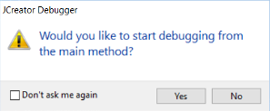 จากนั้นจะปรากฏกล่องข้อความความโต้ตอบที่ถามว่าต้องการจะเริ่มทำการดีบักที่เมท็อดหลักหรือ เมท็อด main ใช่หรือไม่ ให้คลิกปุ่ม Yes กรณีที่ต้องการเริ่มต้นตรวจสอบการทำงานที่เมธอด main แต่หากต้องการเริ่มตรวจสอบที่ส่วนอื่นให้ตอบ No ดังภาพที่ 5-8