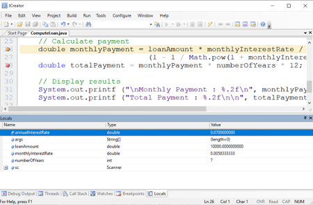 จากภาพที่ 5-12 โปรแกรม JCreator Pro จะหยุดการทำงานอยู่ที่ตำแหน่งของ break point ที่ได้กำหนดไว้ เมื่อถึงตำแหน่งของ break point แล้ว โปรแกรม Jcreator Pro จะแสดงข้อมูลเพื่อให้สามารถตรวจสอบค่าของตัวแปรต่าง ๆ และผลลัพการทำงานได้