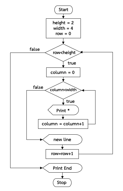 จากโปรแกรมในตัวอย่างที่ 5.9 วงวนภายนอกจะทำซ้ำ 2 รอบ และวงวนภายในจะทำซ้ำ 4 รอบเพื่อพิมพ์ * ดังนั้นผลการทำงานของวงวนภายในคือพิมพ์ * จำนวน 4 ครั้ง แต่เนื่องจากวงวนภายนอกมาควบคุมให้วงวนภายในต้องซ้ำตั้งแต่ต้นทั้งหมด 2 ครั้ง ผลการทำงานจึงมีการพิมพ์ * ทั้งหมด 8 ครั้งใน 2 บรรทัด ผังงานของโปรแกรมเป็นดังภาพที่ 5-7