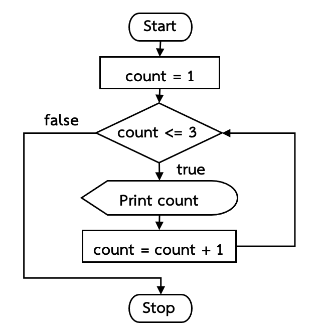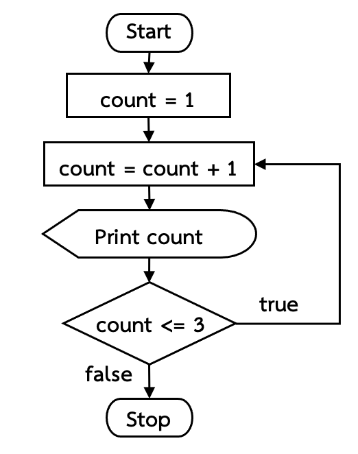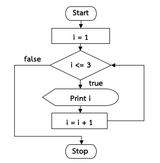ตัวอย่างโปรแกรมการทำงานแบบวนซ้ำด้วยคำสั่ง while ในการพิมพ์ตัวเลขตั้งแต่ 1 – 3 เป็นดังตัวอย่างที่ 5.1 และมีผังงานดังภาพที่ 5-2