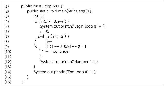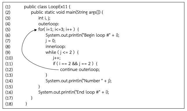 จากโปรแกรมในตัวอย่างที่ 5.12 คำสั่ง continue จะไปขึ้นรอบใหม่ของวงวน for(i=1; i<=3; i++) ซึ่งเป็นวงวนที่มีชื่อ label คือ outerloop ตามที่กำหนดในบรรทัดที่ 12 เนื่องจากในรอบที่ค่า i = 2 และ j = 2 เงื่อนไขของ if เป็นจริง โปรแกรมจึงทำคำสั่ง continue ในบรรทัดที่ 12 แล้วกลับขึ้นไปทำงานที่ต้นวงวนของ for ทำให้ไม่ได้ทำคำสั่งพิมพ์ค่า num ผลลัพธ์ของโปรแกรมจึงไม่มีการพิมพ์ค่า num ในรอบที่ num = 2 และ num = 3 เพราะไปขึ้นรอบใหม่ที่ให้ i = 3