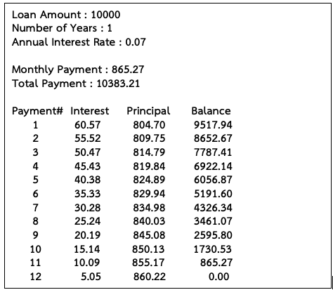 - จากโจทย์ในแบบฝึกหัดข้อที่ 5 ให้เขียนโปรแกรมเพิ่มเติมเพื่อแสดงตารางการผ่อนชำระหนี้ ตัวอย่างผลลัพธ์ของโปรแกรมเมื่อป้อนจำนวนเงินกู้ 10000 บาท จำนวนปี 1 ปี และอัตราดอกเบี้ยต่อปี 0.07 (7%)
