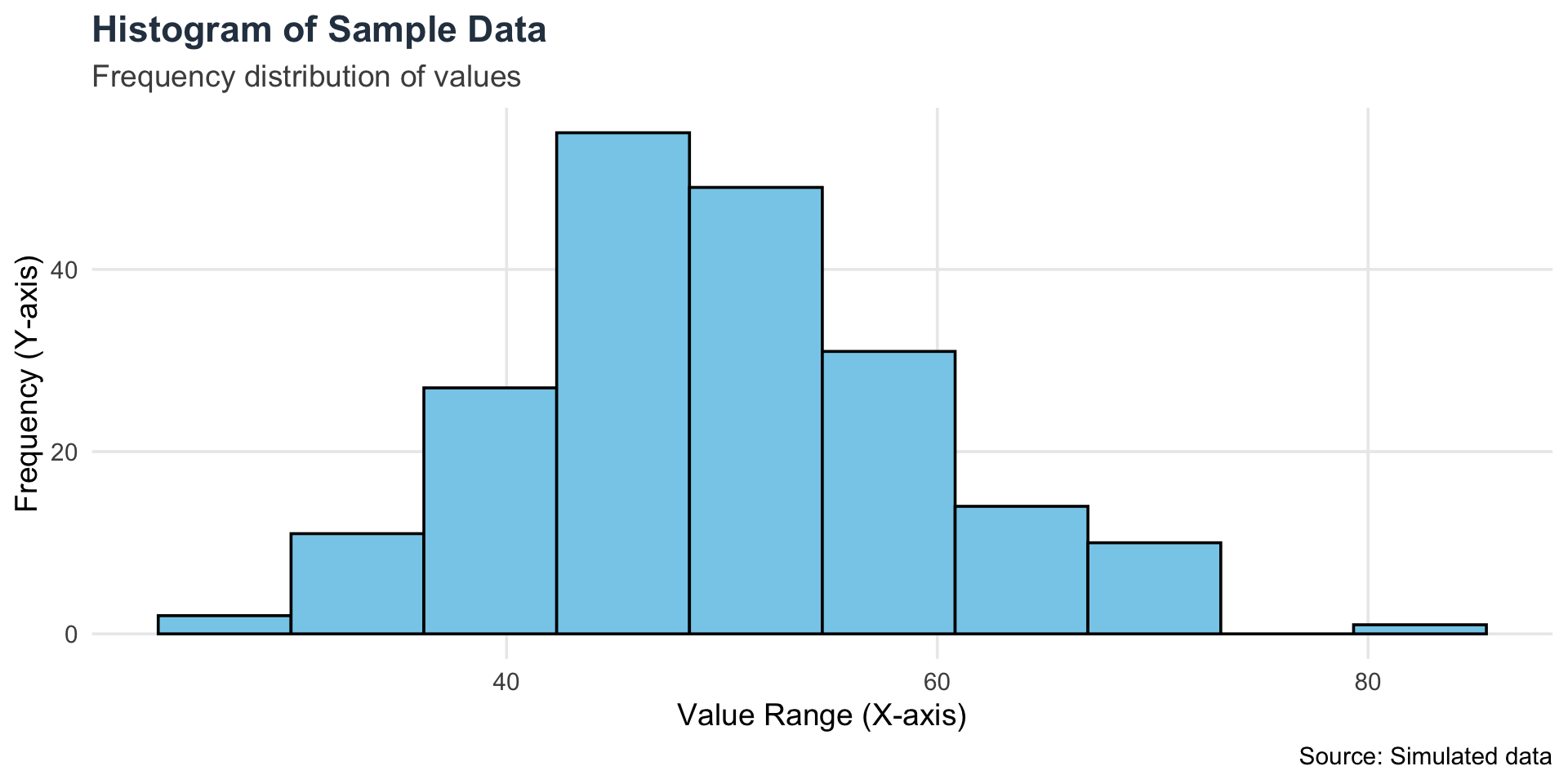 viewof clicks = Inputs.button("Click to Random")The hist() function in R is used to create a histogram, which is a type of plot that shows the distribution of a numeric variable.